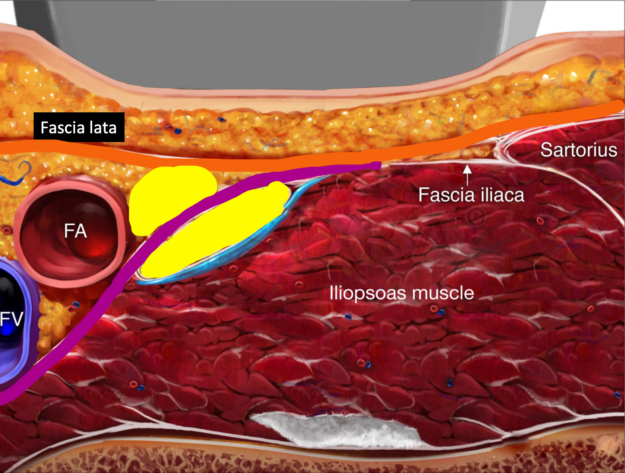 Pillola: trovare facilmente il nervo femorale scansionare dove l’arteria femorale è ancora comune, prima della sua divisione l’arteria femorale comune si trova tra la fascia lata (sopra, colorata di…