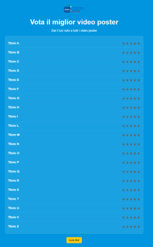 Per l’invio dei voti cliccare sul tasto giallo “invia Voti” ed è necessario votare tutti i video poster perché la votazione sia valida per riavviare la votazione cliccare sul logo ESRA ITALIA in testa alla pagina di votazione.